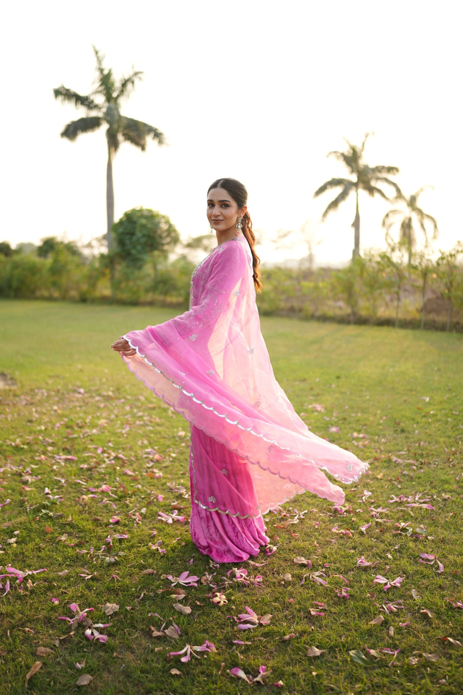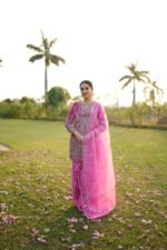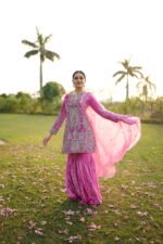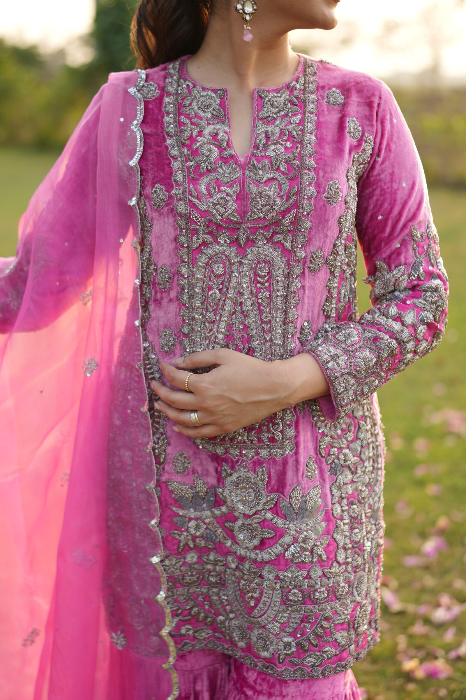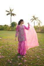 Paired with a beautifully flowing pure velvet gharara, the outfit exudes old-world charm blended with contemporary elegance. The pure organza dupatta is delicately embellished with sippi scalloped embroidery and scattered botti, adding a soft, ethereal finish to the look.
