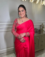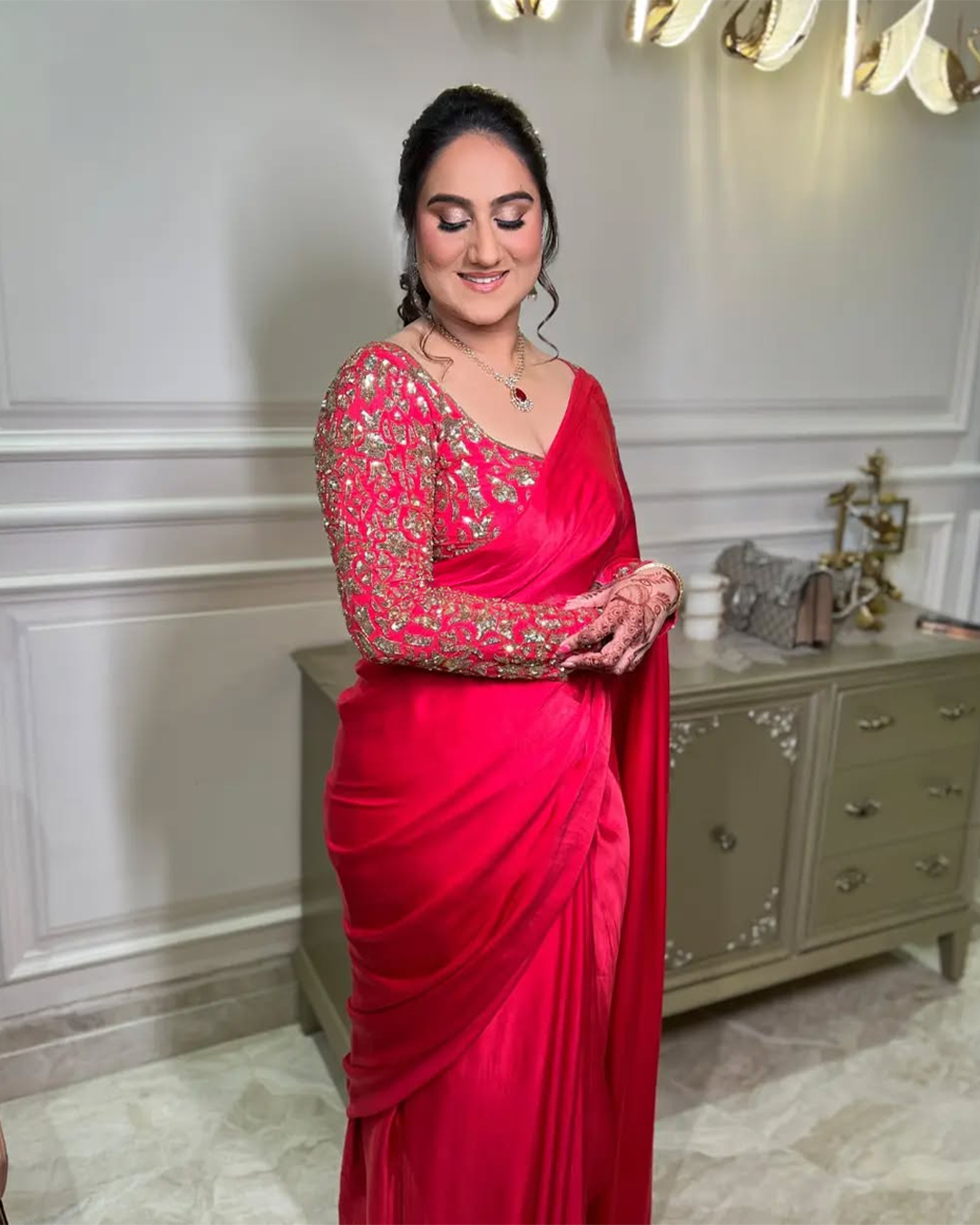 A bold yet elegant statement, this bright red saree pairs perfectly with a full-sleeved blouse adorned in intricate gold and pink embroidery. The rich color and detailed work make it ideal for pre-wedding events or festive evenings.