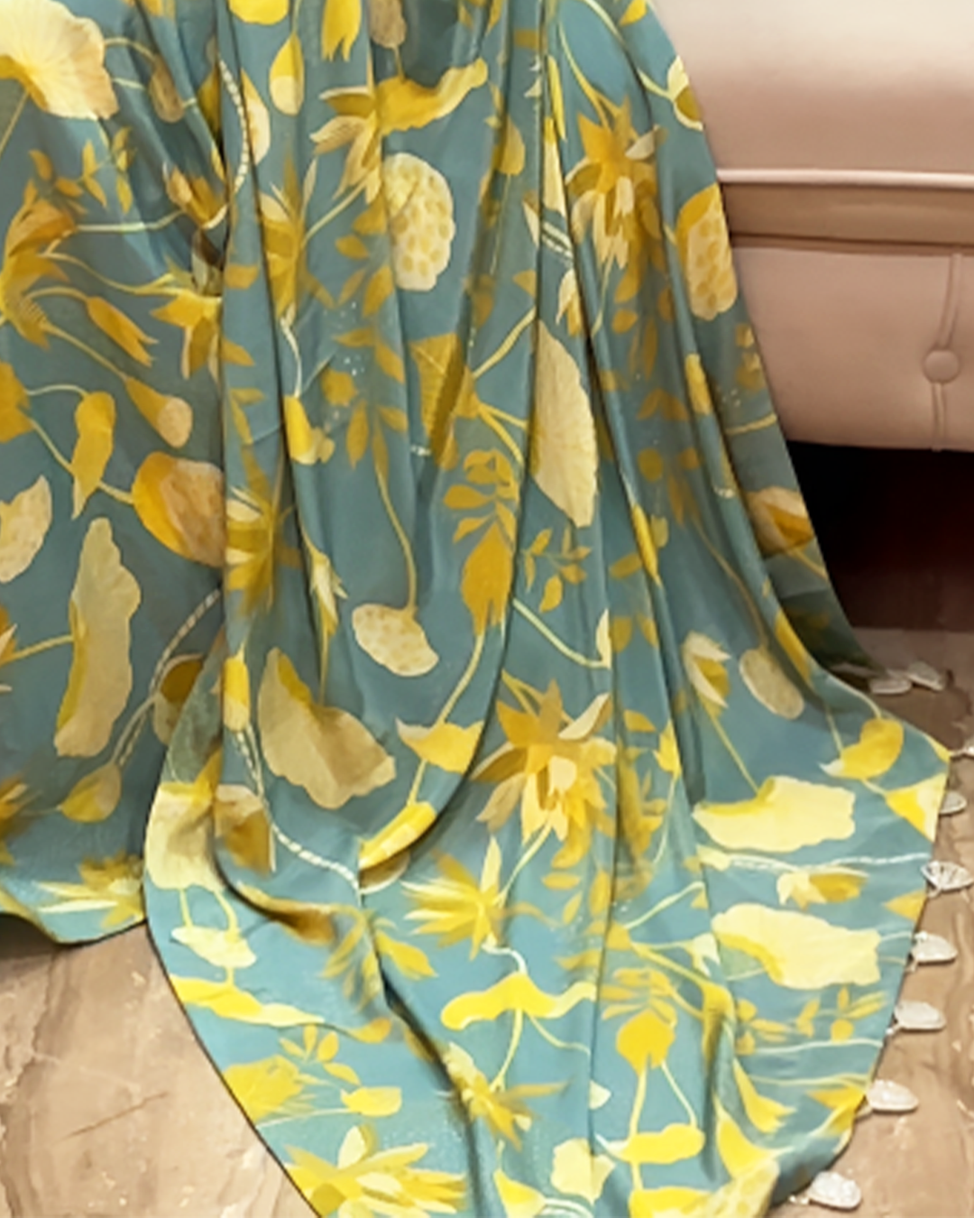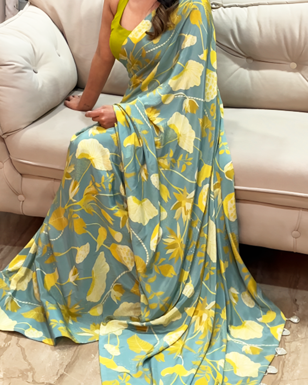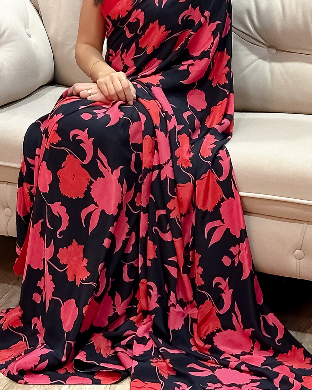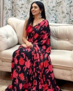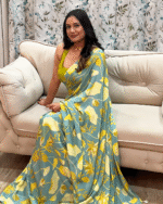 Bring a touch of nature-inspired elegance to your wardrobe with Gulmohar Breeze. Available in two stunning palettes, a refreshing powder blue with mustard and ivory botanical prints, and a bold red and black floral design, this saree is a versatile ode to blooming seasons. Crafted in soft printed crepe, it drapes effortlessly, ensuring comfort for long hours while keeping the look graceful and chic. The contrasting halter blouse in complementing tones adds a contemporary twist, making it perfect for both traditional and modern occasions