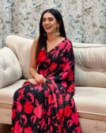 Pair the powder blue saree with dainty gold jewellery or a minimalist choker set, soft waves or a loose bun, and fresh dewy makeup with a bold lip for daytime celebrations. For the red and black saree, opt for statement silver or oxidized jewellery, a sleek bun or straightened hair, and a smokey eye look to elevate it for evening festivities or glamorous gatherings.