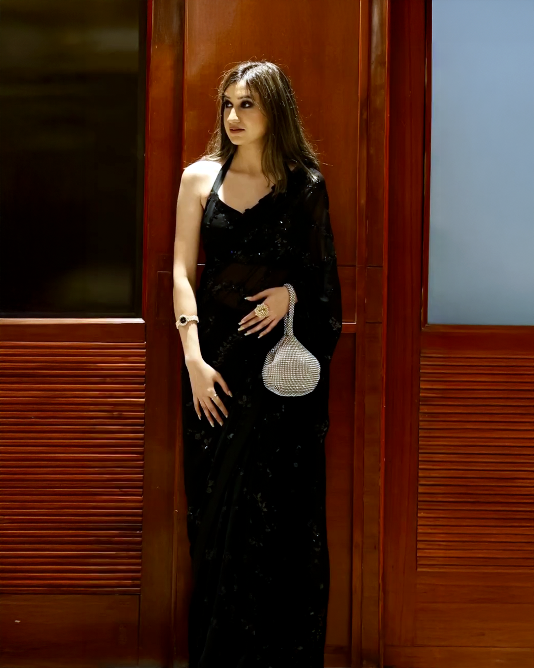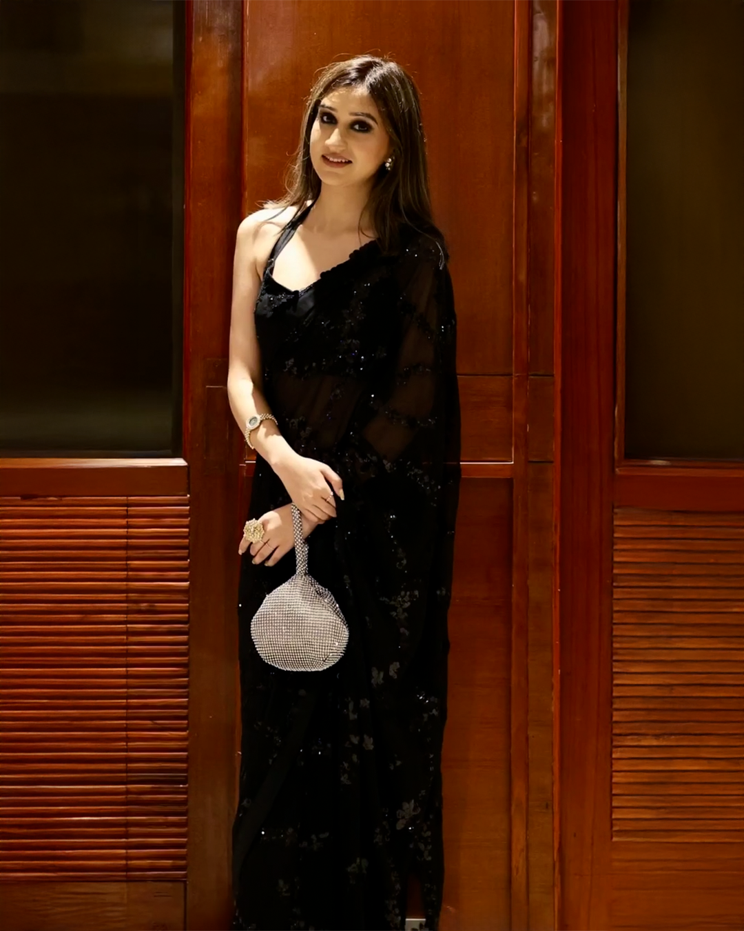 Sultry and sophisticated, the Midnight Muse saree features sheer black fabric with delicate sequin work that catches the light effortlessly. Paired with a bold halter-neck blouse, this look blends glamour with grace — perfect for cocktails, receptions, or glamorous evenings.